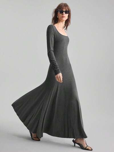 Elegant Split Dress, 2025 New Design, Women Long Sleeve Dress, Dark Gray, Split Design, Flare Skirt, Boat Neck, Casual/Business/Formal Wear Business Casual Women's Clothing Office Clothing Low-Key Old Money Style Effortless Temperament High-End Urban Commuting High-Quality Airport Women's Clothing High-End Material