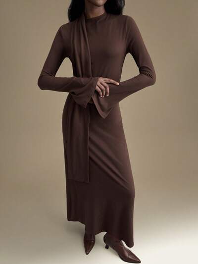 2025 Autumn/Winter Women's Mid-Length Knit Dress, Party/New Year Dress, Camel Color Turtleneck, Simple & Elegant, Suitable For Office, Holiday, Halloween, Christmas, Casual, Versatile, Urban Chic, Guest Attire, Back To School, Fitted Silhouette, Knit Fabric, Long Sleeve. 2026 Spring/Summer Dresses For Valentine's Day, Halloween, Christmas, Thanksgiving, Holiday Outfits, Fashionable & Versatile Mid-Length Dress For Women