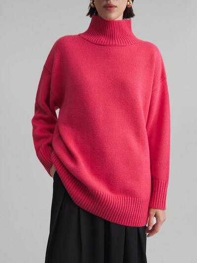 Rose Red Collar Simple Elegant Daily Knitwear Sweater, New Year And , Women Turtleneck Long Sleeve Pullover Sweater, Pink Minimalist Autumn/Winter Clothing-60%