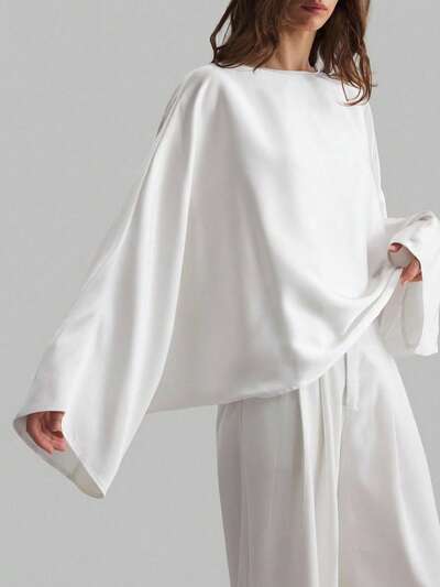 2026SS New Satin Fabric Batwing Sleeve Long Sleeve T-Shirt For Women, Minimalist Elegant Business Casual Outfit, Bestselling Solid Color Boat Neck Retro Back-To-School Style Teacher Uniform, Basic Top For Office, Wedding Guest, Holiday & Vacation