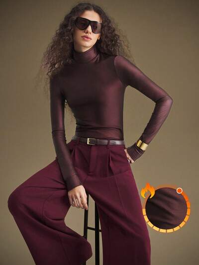 2025 New Modern Urban High Neck Long Sleeve Fitted Stretch Coated Fabric Brown Blouse, Suitable For Business Casual Everyday Wear, Women Apparel Burgundy Brown Modern Urban Casual Fashion Business Casual Women's Office Wear Low-Key Old Money Style Effortless Temperament High-End Urban Commuting High-Quality Airport Women's Wear High-End Material Street Style, Sophisticated, Simple And Cool Christmas Women's Clothing New Year Look Purple Clothes,Fall,Fall Clothes For Women