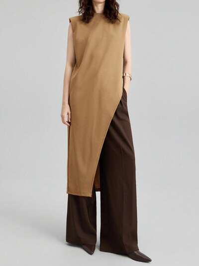 2026 Spring/Summer Women's Color Block Sleeveless Loose Asymmetric Hem Long Blouse, Versatile For Urban Commute, Business, Casual, Elegant For Occasions Like Valentine's Day, Summer Wedding Guest, Holiday, Beach, Office