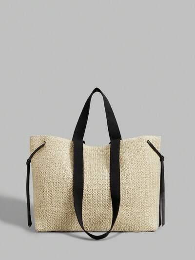 Ladies Large Capacity Straw Tote Bag With Webbing Shoulder Strap Detail For Holiday Commuting-15%