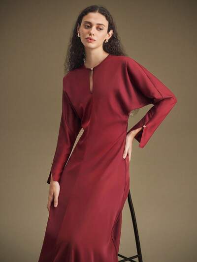 Elegant Style, Minimalist Design, Satin Fabric, Burgundy Color, Long Sleeve, Raglan Sleeve, Neckline Design, Loose Fit, Waist Cinched, Women's Mid-Length Dress, Autumn Clothing, Casual Wear, Business Casual Burgundy Modern Urban Casual Fashion Business Casual Women's Office Wear Low-Key Old Money Style Effortless Temperament High-End Urban Commuting High-Quality Airport Women's Wear High-End Material High-End, Elegant, Old-Fashioned Cruise Clothing Wedding Guest Dress For Women Christmas Women's
