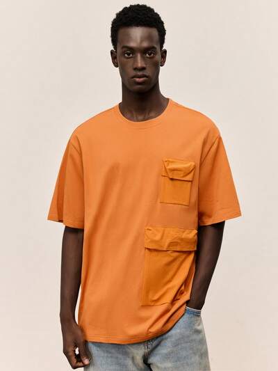 Men Solid Color Orange Patch Pocket Round Neck Short Sleeve T-Shirt, Suitable For Summer