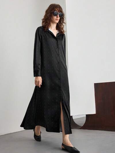 2025 Autumn/Winter Apparel, Suitable For 5-15°C Wear, Elegant Black Polka Dot Fabric, Loose Fit Design, Women's Long Dress, Business Casual, Commute, Daily Wear, New Year & Christmas Outfit For Women