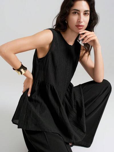 Black Casual Loose Fit Round Neck Sleeveless Blouse With Ruffled Hem For Women