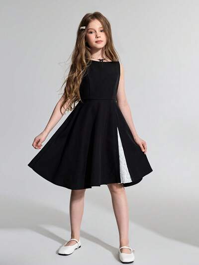 Tween Girl Woven Black Contrast Lace Contrast Color Sleeveless Elegant Dress