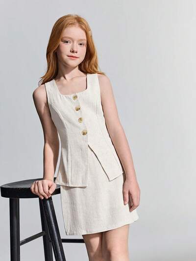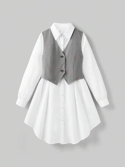 Tween Girl Collared Long Sleeve Shirt Dress With Vest 2 Pieces Outfit