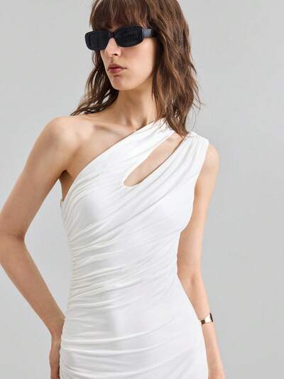 2025 Women's Solid Color Hollow Asymmetric Neckline Ruched Sleeveless Dress, Suitable For Independence Day, Beach, Graduation, Office
