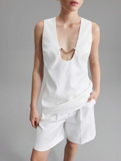2025 New Style Wedding Outfit White Sleeveless Tank Top And Bermuda Shorts Wrinkled Fabric 2pcs Set For Women, Spring/Summer