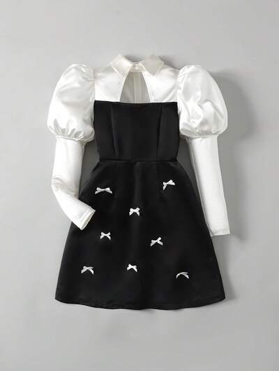 Tween Girl Woven Contrast Color Collar Petal Sleeve Bowknot Dress