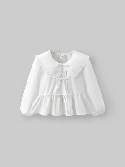Tween Girls Casual Loose Fit Peter Pan Collar Bow Decor Long Sleeve Blouse