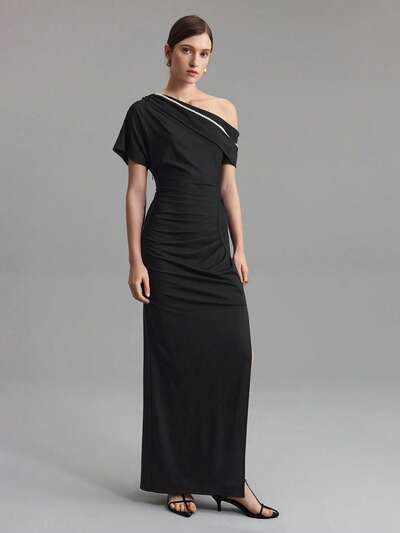 2025 Women Pearl Asymmetric Ruched High Slit Dress