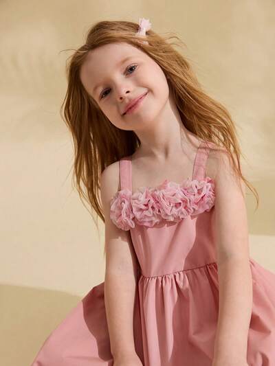 Young Girl Solid Color Dress With 3D Floral Decor Spaghetti Strap