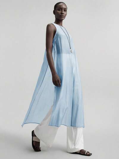 2026 Spring/Summer New Women Round Neck Sleeveless Semi-Sheer Blouse With Side Button, Long Casual Top For Urban Commute, Versatile Business Casual Elegant Outfit, Suitable For Party, Wedding Guest, Holiday, Beach-49%