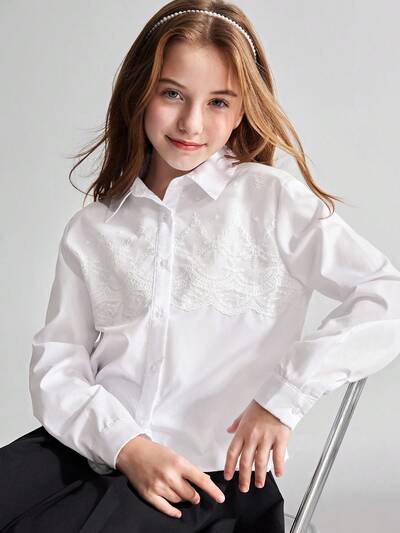 Tween Girl Lace Patchwork Decorated Turndown Collar Long Sleeve Blouse Girls White Shirt Long Sleeve White Shirt For Girls Girls Long Sleeve Blouse Girls White Embroidered Shirt Girls White Collared Shirt