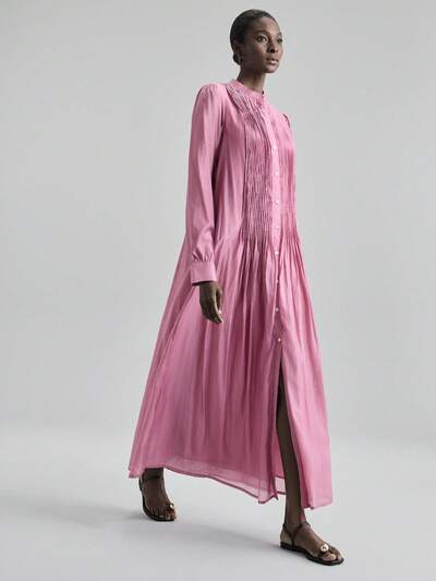 2026SS New Summer Women's Extra Long Dress, Long Sleeve Ruched Loose Dress, Elegant Minimalist Bohemian Style, Beach Holiday, Resort, Urban Chic Pleat Design, Solid Pink Color, Ladies Outerwear, Tea Party, Independence Day Fashion Versatile Dress-26%