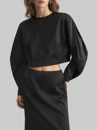 2025 Spring Women's Short Cropped Long Sleeve Shirt, Shirt Collar Design, Metal Zipper Trim, Elastic Hem, Casual Urban Style-60%