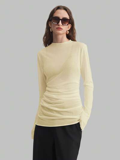 2026 New Versatile Long Sleeve Mid-Length Women's Top, Knit Fabric T-Shirt For Daily Wear, Ruched Waist Design, Round Neck Semi-Sheer Chic Urban Style Modern Urban Casual Fashion Business Casual Women's Office Wear Low-Key Old Money Style Effortless Temperament High-End Urban Commuting High-Quality Airport Women's Wear High-End Material-32%