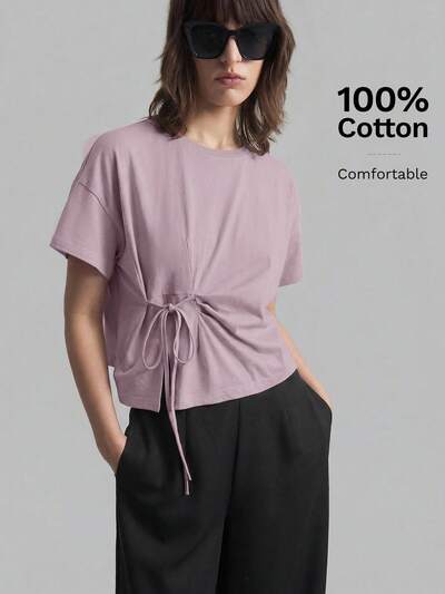 2026 Purple Casual Round Neck Off-Shoulder Short Sleeve Belted T-Shirt, Women's Autumn Versatile Casual Wear Series,Summer Top-11%