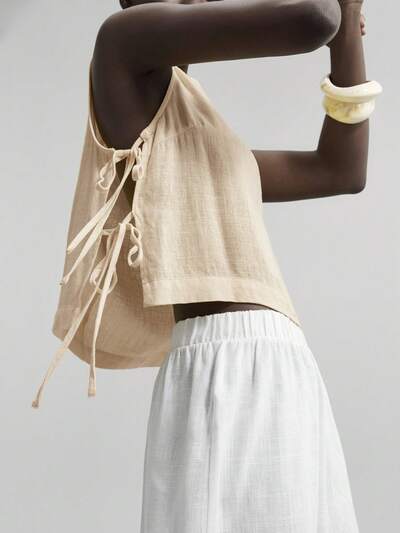 2026SS Women's Solid Color Linen Fabric Side Slit Bow Tie Design Round Neck Sleeveless Vest, Urban Commute Business Casual Elegant Top, Suitable For Holiday, Party, Summer-45%