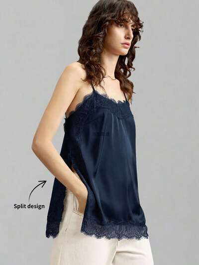Women's Burgundy Satin Satin Fabric Comfortable Soft Lace Trim Spaghetti Strap Side Slit Design Camisole Top, Suitable For Urban Commute, Business Casual, Elegant Attire For Dates, Weddings, Parties, And Vacations