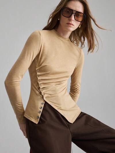 Women's Asymmetric Deconstructed Design Long Sleeve Button T-Shirt, Elegant For Urban Commute And Business