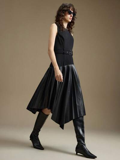 2025 Autumn/Winter New Arrival Woven Patchwork Pleated Faux Leather Fabric, Fitted Waist Design, Women's Long Dress, Business Casual, Commute, Daily Wear, Suitable For Halloween, Date, Party, Outing, Christmas,Christmas, New Year Black Dress Women