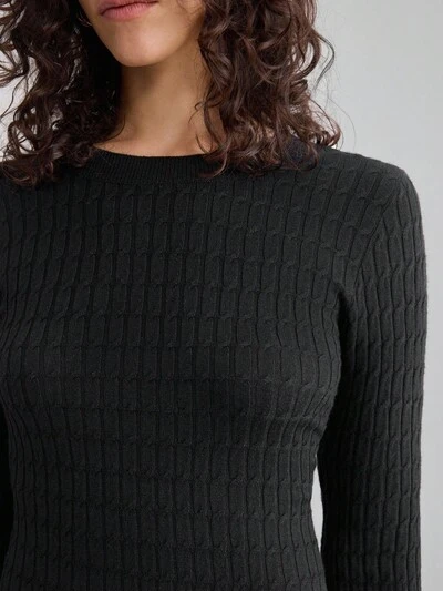 Modern Urban Style,Black Dress, Women's Knitted Sweater Dress, Pullover Knitted Dress, Round Neck, Long Sleeve, Loose Fit, Twist Flower Knitting, Minimalist Design, Minimalist Style Casual Style, Autumn Clothing, 2025 New Arrival, Business Casual, Old Money Style, Back To School Season Modern Urban Casual Fashion Business Casual Women's Office Wear Low-Key Old Money Style Effortless Temperament High-End Urban Commuting High-Quality Airport Women's Wear High-End Material Waist Detail Flared Dress
