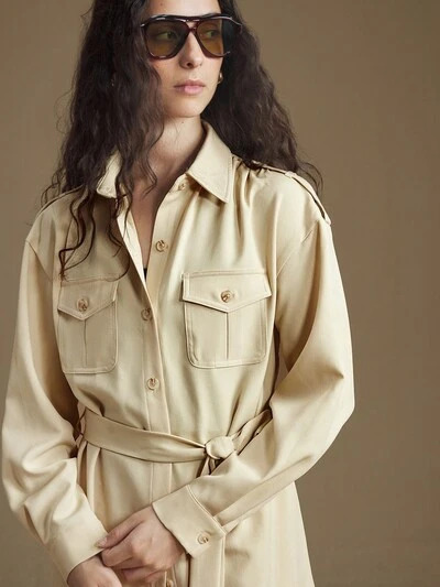 2025 Modern Urban Style, Cream Yellow Khaki, Soft & Comfortable Fabric, Utility Pockets, Cinched Waist Loose Fit, Open Front, Women's Shacket, Lapel Collar, Business Casual, Office Commute, Daily Wear, Autumn/Winter