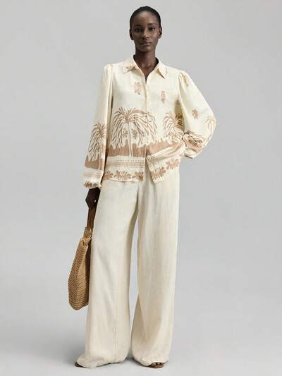 2026 Spring/Summer Women's Long Sleeve Single-Breasted Pocket Shirt And Wide-Leg Pants Casual Suit, Retro Style, Suitable For Office, Business Casual, Dating, Outing, Airport, Party, Valentine's Day, Wedding Season