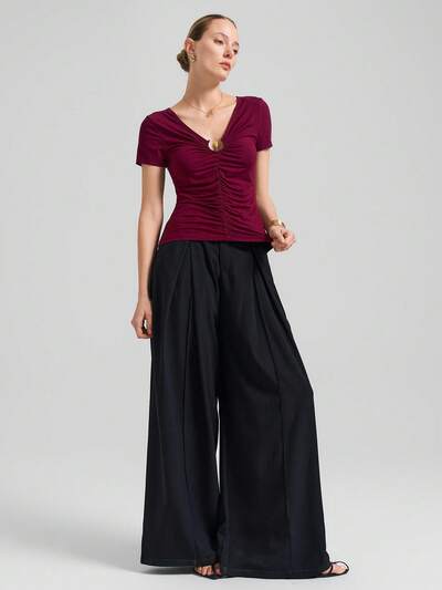 2025 New Arrival Elegant Style Knitted Viscose Fabric Soft & Comfortable Short Sleeve V-Neck Ruched Front Women T-Shirt, Daily Wear, Spring/Summer