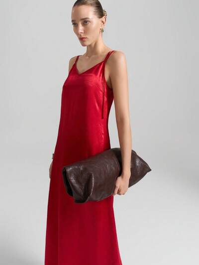 Women's Summer Red 100% Viscose Spaghetti Strap Sleeveless Casual Long Dress, Suitable For Summer Vacation