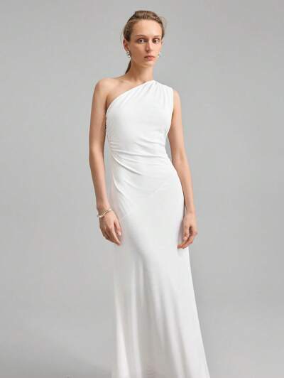 Women's Summer Asymmetrical Neck Elastic Fitted Dress, Fashionable Strapless Long Dress Suitable For Summer