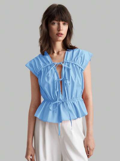 Women's 2025 Spring New Blue Simple Tie-Up Blouse, Casual Daily, Suitable For Valentine's Day, School Wear And Outgoing