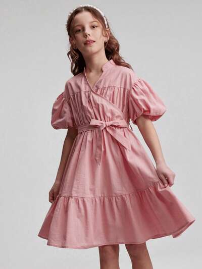Spring/Summer Tween Girl Solid Color Bamboo Texture Fabric Stand Collar, Elastic Waist, Puff Sleeve Design Loose Casual Comfortable X-Shape Pullover Dress, Fashion Simple Country Style For Outing, Home, School-45%