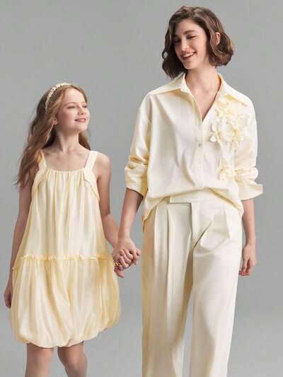 Tween Girls' Solid Color Loose Fit A-Line Flower Petal Hem Sleeveless Light And Textured Apricot Mid-Length Casual Dress, Versatile For Outings, Home, School, Vacation, Spring/Summer-60%