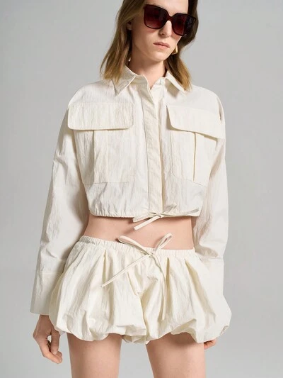 1980s-1990s Vintage Style Women's Spring New Arrival 2025 Cropped Drawstring Trench Coat, White Thin Casual Shirt Collar Jacket