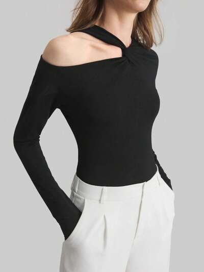 Women's Black 90s Style Elegant Twisted Neck Asymmetric Long Sleeve Elastic Bodysuit