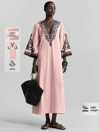 2025 Women's Summer Long Dress, Solid Color, Fashion, Suitable For Summer. Black Embroidered Pattern, Bohemian Style, Flare Sleeves, Oatmeal Color Loose & Comfortable Long Dress, V-Neck, Suitable For Party, Vacation, Island Resort, Music Festival, Summer-33%